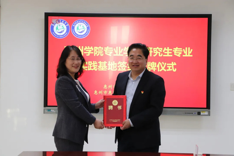 首先,谢伟强书记与付军校长就实践基地的建立进行签约,并授牌,随后谢桂新副院长向付军校长颁发了惠州学院兼职副教授证书。