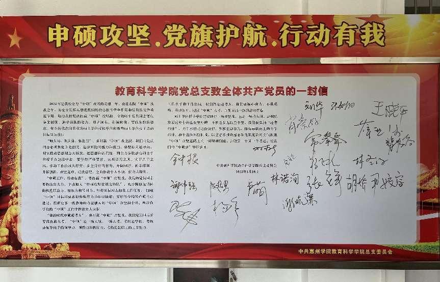 最后,全体党员进行了签名活动,在《教育科学学院党总支致全体共产党员的一封信》宣传栏的空白处,庄重的把自己名字写上,表明了勇于承担责任,积极主动作为,使我们的“申硕梦”早日梦圆的决心。