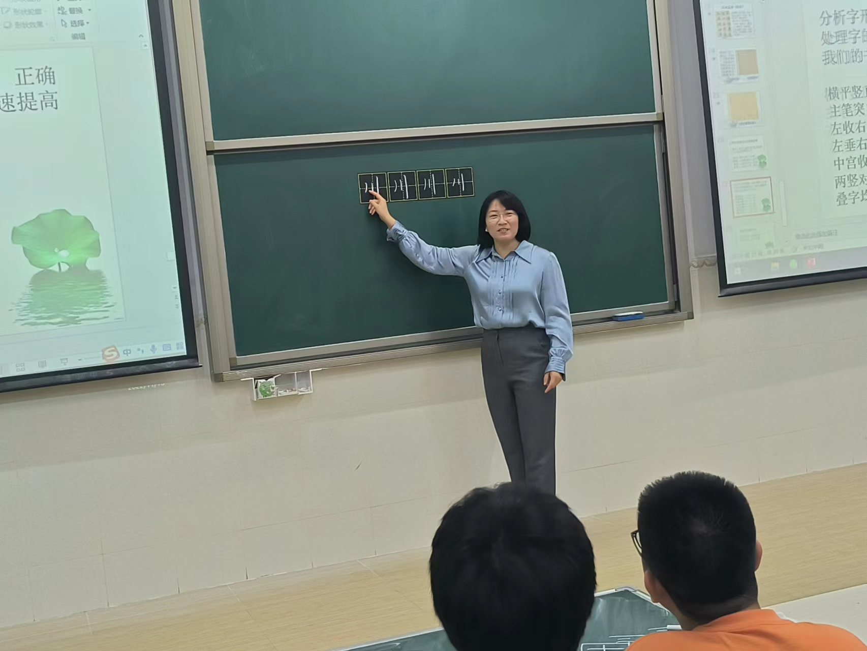 黄小玲老师主要从理论和实践两方面指导同学们练习粉笔字。首先,黄老师以视频规范同学们的粉笔执笔方法,强调了用笔的细节要求。接着,黄老师讲解了五大书法字体分类:篆书、隶书、草书、行书和楷书,针对小学教育专业的特点,着重讲解了楷体书法四大家的楷书风格特点。然后,她为同学们详细讲解了粉笔书写的练习方法和步骤,建议同学们从楷书入手,做到“眼到”“手到”和“心到”,分析字形特点,找到规律,正确处理字的结构关系。结合粉笔字的实践演练,黄老师针对同学们的粉笔字进行了精彩点评,提出了许多宝贵的建议,让同学们受益匪浅!最后,黄老师在与同学们的积极互动中分享了几十年的练字宝贵经验,提出“行动以思想作为指导”,要按步骤和方法在练习中有意识地总结经验,粉笔字书写水平就会逐步提高。