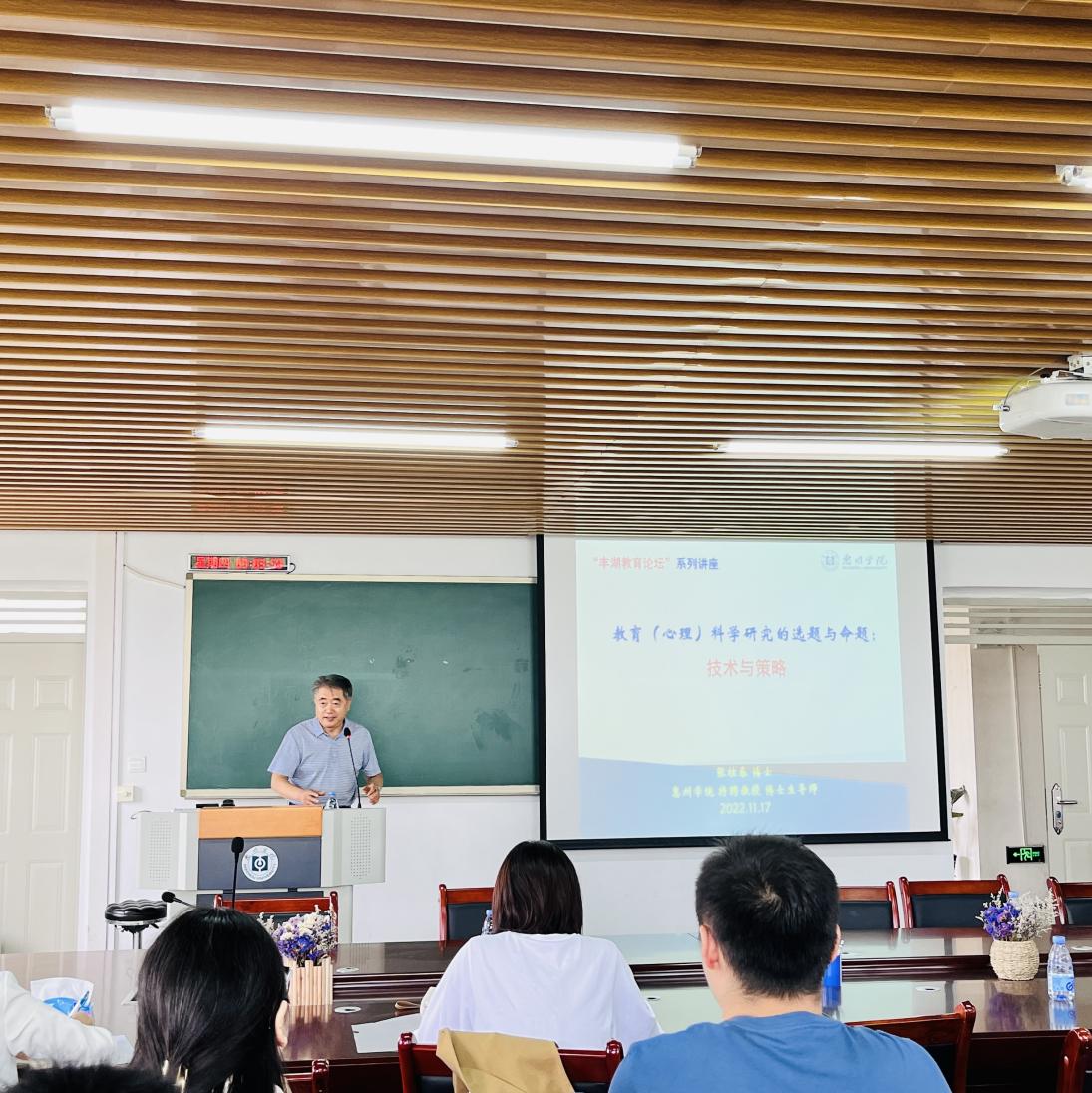 为落实学校科研工作改革实施方案,进一步提升教师科学研究能力,11月17日上午,教育科学学院在旭日教学楼621会议室举办了“丰湖教育论坛”讲座。惠州学院特聘教授、原辽宁师范大学教育学院副院长张桂春教授为教育科学学院全体专任教师作了《教育(心理)科学研究的选题与命题:技术与策略》主题讲座。