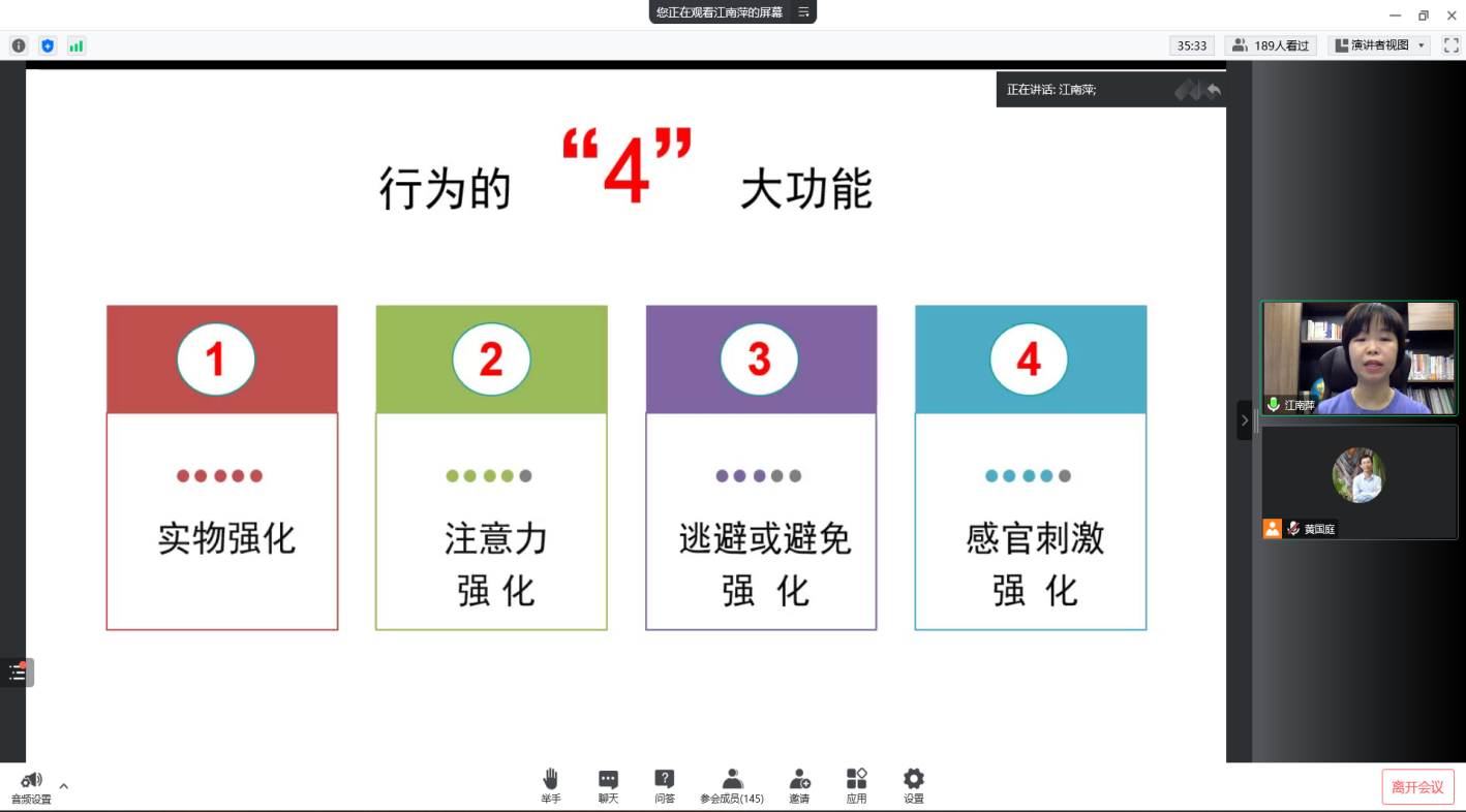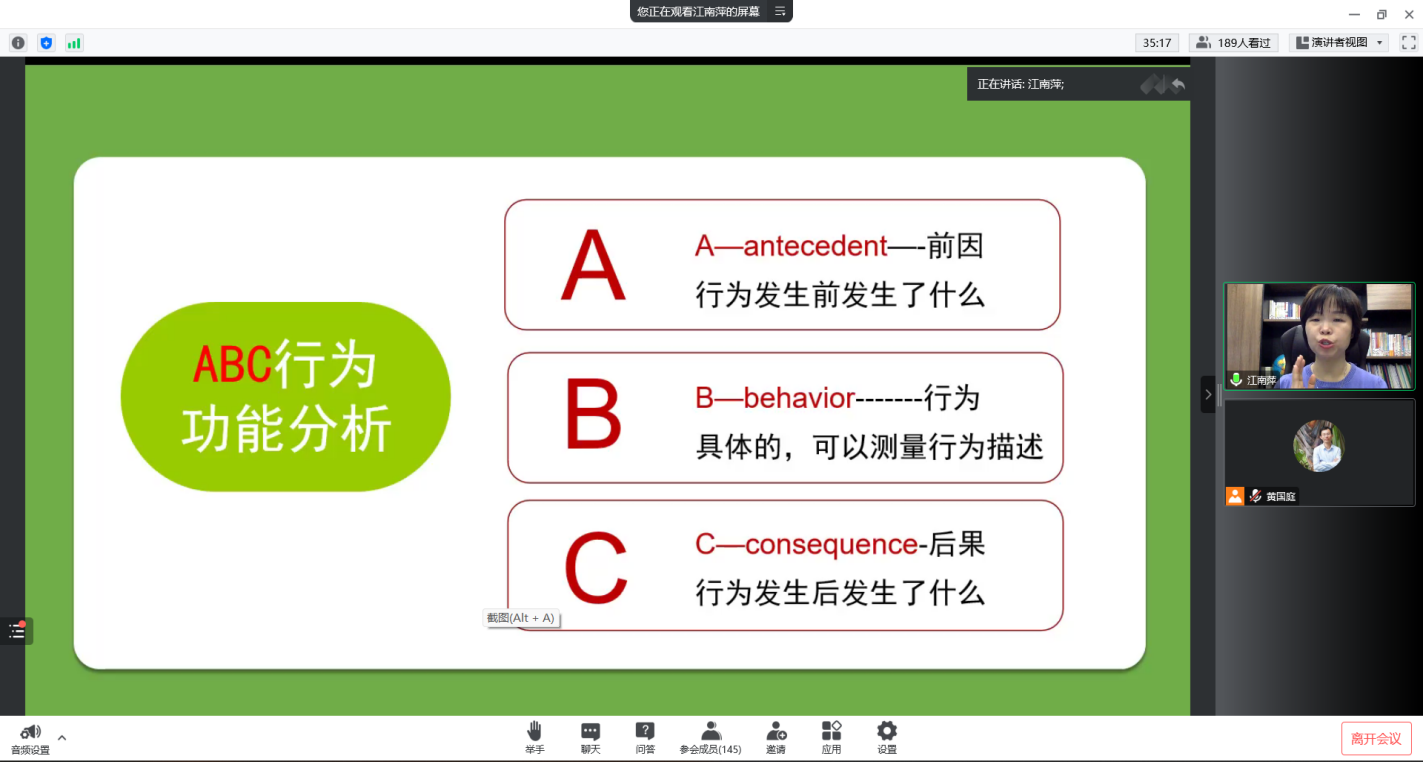 11月19日晚,惠州市惠城区指南针融合康教中心负责人、国际助理行为分析师(BCaBA )江南萍老师应邀为教育科学学院学子开展以“幼儿园融合环境中ASD问题行为的干预小妙招”为主题的线上专题讲座。讲座由学前教育系主任黄国庭主持,学前教育专业19级、20级全体学生,及其他感兴趣的师生共同参与。