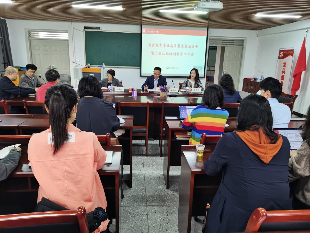 为进一步推进学前教育专业高质量发展,做好专业认证工作,3月30日上午,教科院在旭日楼621召开专题培训指导会。会议由党总支书记谢伟强主持,教育科学学院全体教职工参加。教务处处长陈益智,副处长陈国钦,教学质量科科长肖莉丹出席会议,并做学前教育专业建设培训和指导。