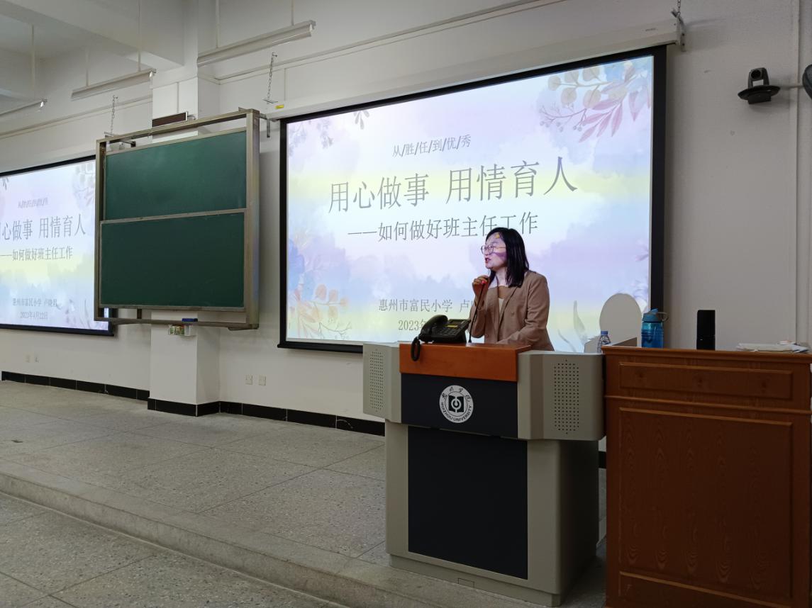 教师是学生人生道路上的引路人。为了更深入地了解、学习班主任工作技能,帮助2020级小学教育的同学在以后教师职业生涯中更快更好地成长。2023 年 4 月 22 日下午,惠州市富民小学卢晓君老师应邀为 2020 级小学教育专业的同学开展嵌入式课堂教学,主题为“用心做事,用情育人—如何做好班主任工作”。讲座在旭日101 教室举行,由卢萌老师主持。