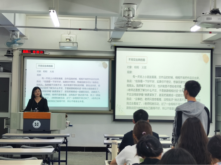 董老师带来了“不肯交出的画”“为什么孩子们不跑了”“扫地机器人”、光与影”“纸杯蛋糕”五个案例,从具体事例、背景知识、分析与评价、思考与策略四个方面进行解读,带领同学们了解在幼儿园如何对幼儿的行为进行评价。在解读过程中,董老师强调观察评价需要结合相关背景知识和进行更全面的了解,才能做出更加准确的评价。最后,董老师分享了她的教育信条:“多观察、多分析,别轻易评价”“尊重孩子,了解孩子,与孩子玩到一起去”,同学们深受启发。