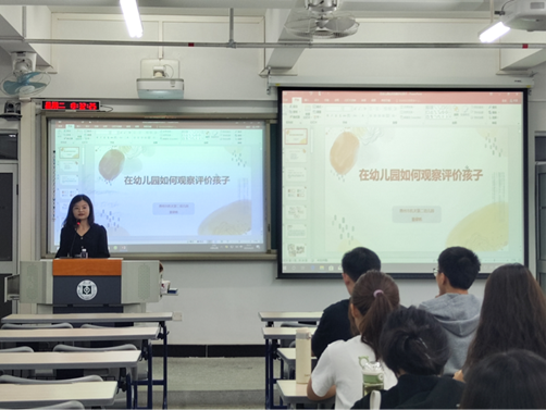 2023年4月23日晚上19:30,教育科学学院特邀惠州市机关第二幼儿园董健帆老师为2020级学前教育的同学们开展《学前教育评价》的嵌入式教学讲座,讲座由吴钢老师主持。