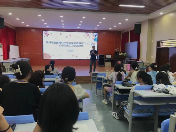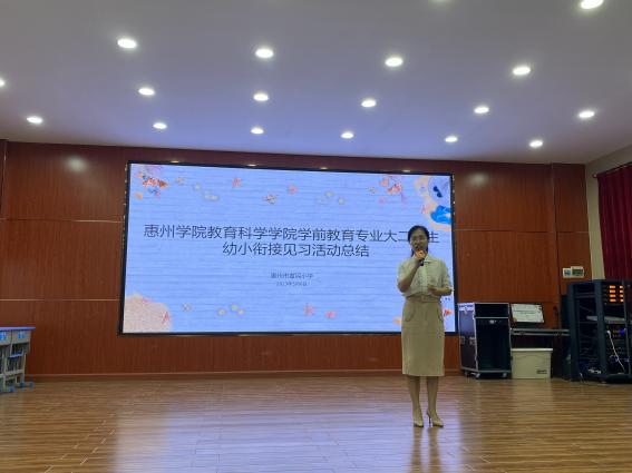 惠兴小学见习总结会,参会人员有惠兴小学赖新文校长、吴惠萍副校长,惠州学院段飞艳老师以及21级学前教育2班全体学生。会议由吴惠萍副校长主持。首先,陈慧敏、骆婷婷、李雨句、汪佩钰、肖剑怡同学作为班级代表上台分享见习感悟。接着赖新文校长发表讲话,他指出,幼儿园教师承担着培养国家未来接班人的重任。他鼓舞年轻人要积极进取,定好自己的目标,一步步去落实,做一个“四有”好老师,对待幼儿要具有公平心、公正心、耐心和爱心。最后,我院段飞艳老师上台发言,对同学们见习期间的表现予以肯定,同时表达对惠兴小学的感谢。