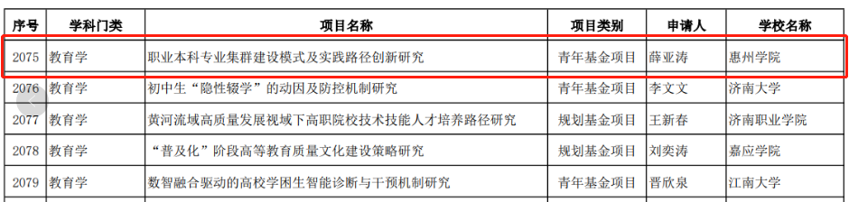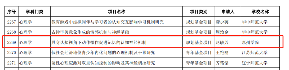 经个人申报、专家评审,教育科学学院赵敏芳老师申报的课题《具身认知视角下动作操作促进记忆的认知神经机制》获规划基金资助,薛亚涛老师申报的课题《职业本科专业集群建设模式及实践路径创新研究》获青少年基金资助。据悉,惠州学院今年共有4项获准立项。