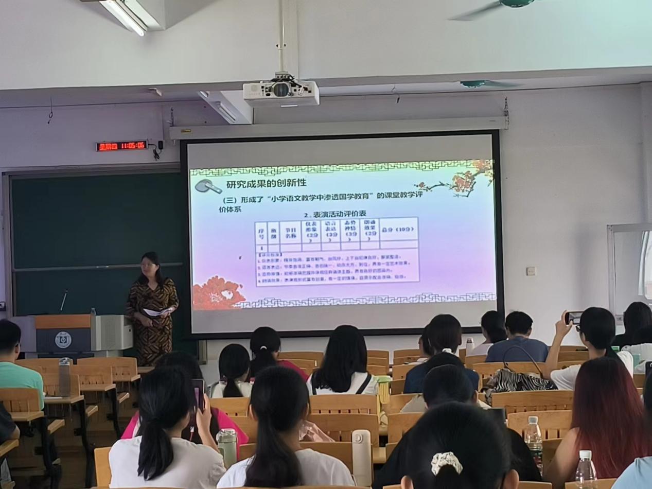 首先,陈萍老师简要介绍自己的科研课题“小学语文教学中渗透国学教育的教学模式与策略探究”的大背景。接着,陈萍老师和同学们分享了“小学语文教学中渗透国学教育”的教学策略、教学模式和课堂教学评价。一是“小学语文教学中渗透国学教育”的教学策略,主要是在于汇编国学读本,延伸课堂教学;营造国学氛围,打造“国学文化班”;充分利用新媒体,弘扬传统文化。二是构建了“小学语文教学中渗透国学教育的教学模式”,即“六书与识字融合”的识字教学模式、“成语与阅读教学融合”的成语教学模式和“古文化与古诗教学融合”的古诗教学模式。三是形成了“小学语文教学中渗透国学教育”的课堂教学评价体系,课题组围绕课堂教学的实际设计了系列评价量表。最后,陈萍老师与同学们分享了合生实验学校老师制作的微课视频——《墨梅》和《泊船瓜洲》,旨在让大家了解微课的内容要素,利用微课弘扬中华优秀传统文化。