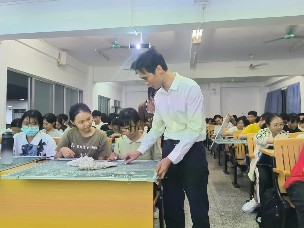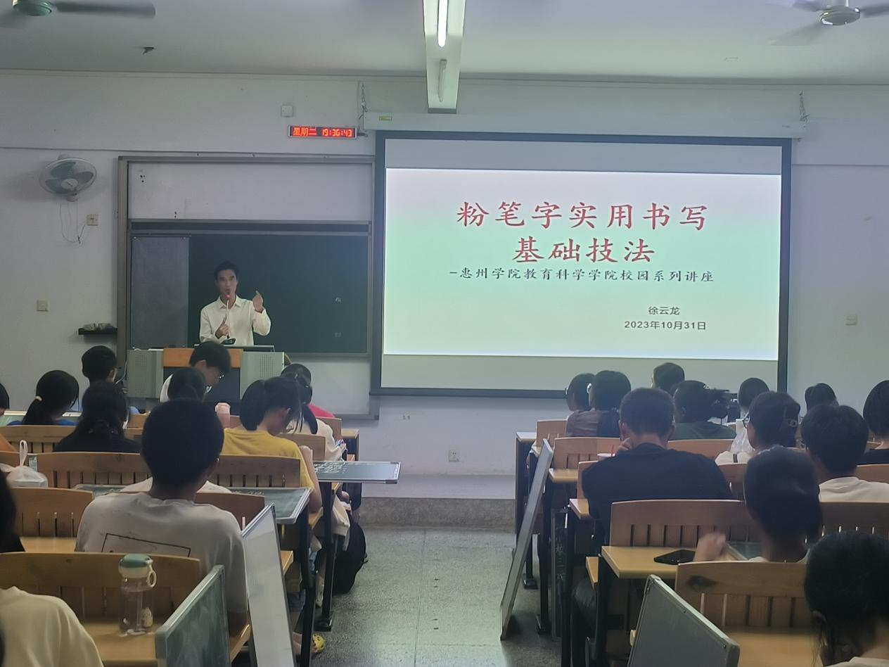 10月31日晚,中国书法协会会员,惠州市书法家协会副主席徐云龙应邀在旭日楼405为我校教育科学学院小学教育系23级学生开设粉笔字书写技巧讲座。23级小学教育专业全体学生参加了此讲座。