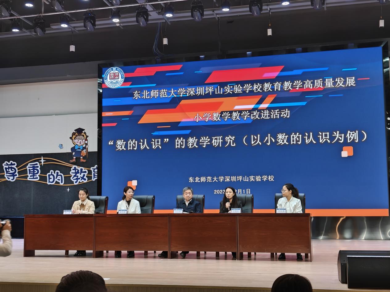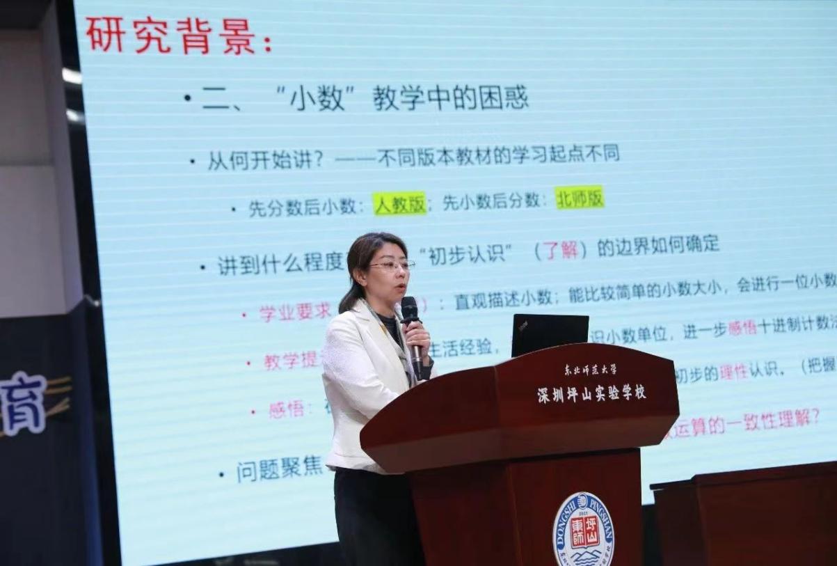 接下来由东北师范大学深圳坪山实验学校脱中菲副书记进行研究汇报《走向专业学科理解——<以小数的初步认识>为例》。脱书记介绍了小数的初步认识单元研究背景与教学中存在的困惑,以及一个多月来教研组努力打磨课程的全过程。通过脱书记的汇报,同学们进一步加深了对两节示范课设计思路的认识。
