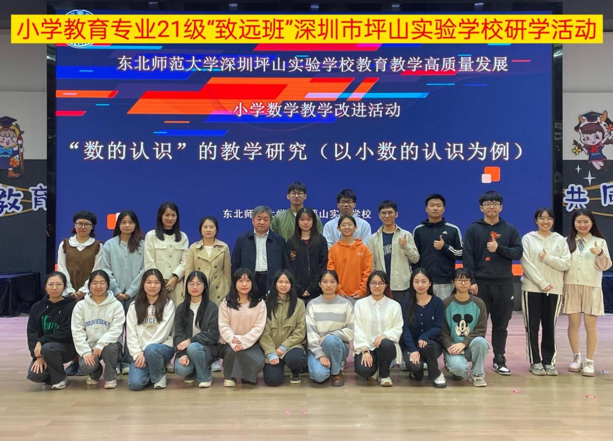 2023年12月1日上午,21级小学教育专业 “致远班”在卢萌老师带队下前往东北师范大学深圳坪山实验学校参加教育教学高质量发展项目:小学数学课堂教学改进研讨会。本次活动旨在扎实推进“双减”政策,践行落实新课标理念,提高数学教师教学研究水平。活动邀请到东北师范大学马云鹏教授和王艳玲副教授为点评嘉宾。研讨会主要有三项议程:现场教学展示,研究汇报以及专家点评。