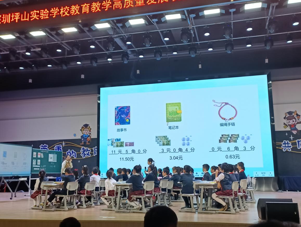 首先是由东北师范大学深圳坪山实验学校季伟和胡冰清两位老师带来的展示课。两位老师选取的是“数与代数”领域下的数与运算主题中《小数的初步认识》和《小数的加减法》两个内容。两位老师均通过义卖活动引入,课堂注重学生发现问题、提出问题、分析问题和解决问题能力的培养,注重引导学生感悟数的概念和运算本质上的一致性。课堂运用多种学习方式,特别注重学生积极性的调动,学生课堂参与度极高。