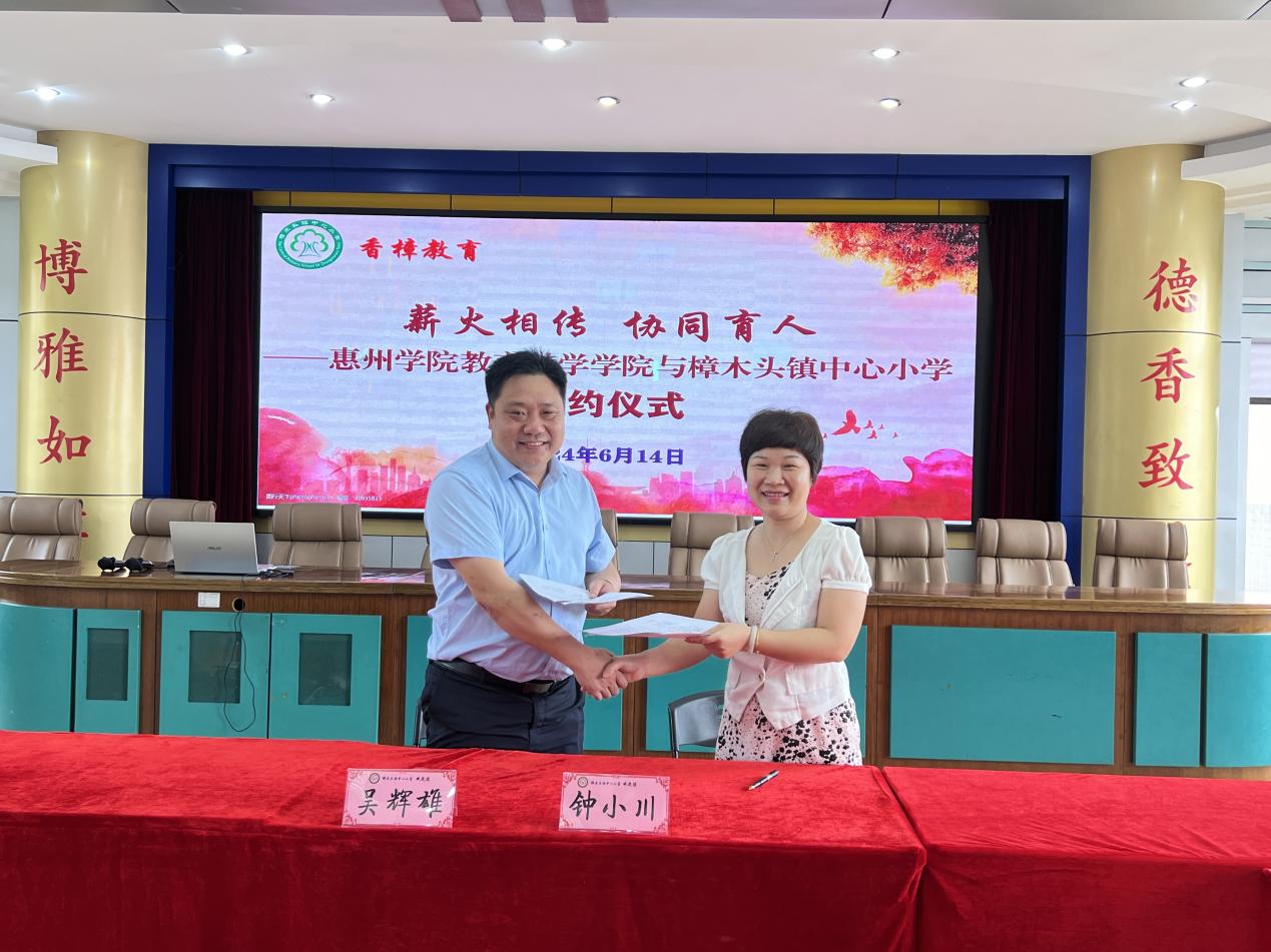 一行人先到樟木头镇中心小学,受到该校领导班子的热烈欢迎。钟宋天书记对学院师生给予的信任和支持表示感谢,对学校的办学历史和办学理念作了介绍,对双方建立稳定的合作关系表示祝贺。学院副院长金艳在介绍学院发展情况的基础上,对与樟木头中心小学今后的互利共赢深度合作提出了设想,希望以实习基地的建立为契机,促进双方人才培养质量的稳步提升。钟小川与樟木头镇中心小学吴辉雄校长代表签订实践教学基地合作协议书。在友好融洽的氛围中,双方就教育实习、协同育人、资源共享等诸多方面达成共识。