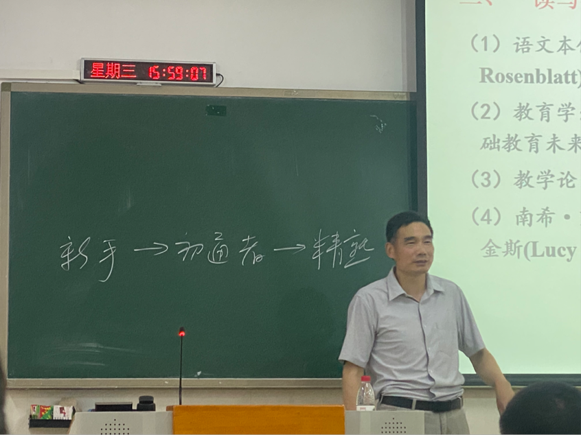 紧接着,王老师详细阐述了“读写教室”研究的逻辑起点、理论基础以及主要研究领域,深入分析了当前语文教材的变化趋势,并探讨了当前语文教学的新趋势。同时,王老师还分享了国内外先行者在语文阅读教学中的实践经验,并提出了创新的教学策略。此外,王老师还向同学们分享了他在教育一线的教学经验,提出“我们应该把重心放在研究学生学习上”的观点,通过对课堂话语、课堂问答环节的分析,深入研究学生的学习特点和行为,鼓励学生提出教师未发现的问题,真正做到翻转课堂,而不是为了翻转而翻转。