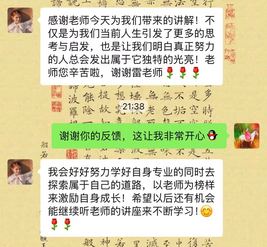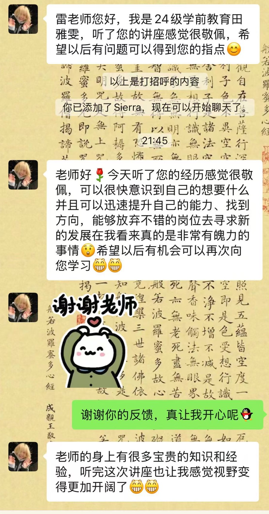 讲座期间,雷素娟园长分享了其在创业历程中的宝贵经验:从放弃稳定的工作到开始创业项目的初始构思,从艰辛受挫到重新出发,深入市场调研。深入浅出的讲解与真实案例的生动呈现,让在场同学深受触动,收获颇丰。其中,雷素娟园长就参加培训沉淀提高个人能力,以独到的眼光选择课程体系在国内落地进行了深入剖析,她用精准的数据与独到的视角,为学前教育的学生们指明了未来的发展方向,她说,创业不仅给她带来了自律的习惯,持续的学习力,更教会她如何感恩,如何爱自己,一条创业之路,也是一条生命意义的探索之路。其关于意义的阐述深深打动了在场的同学们。