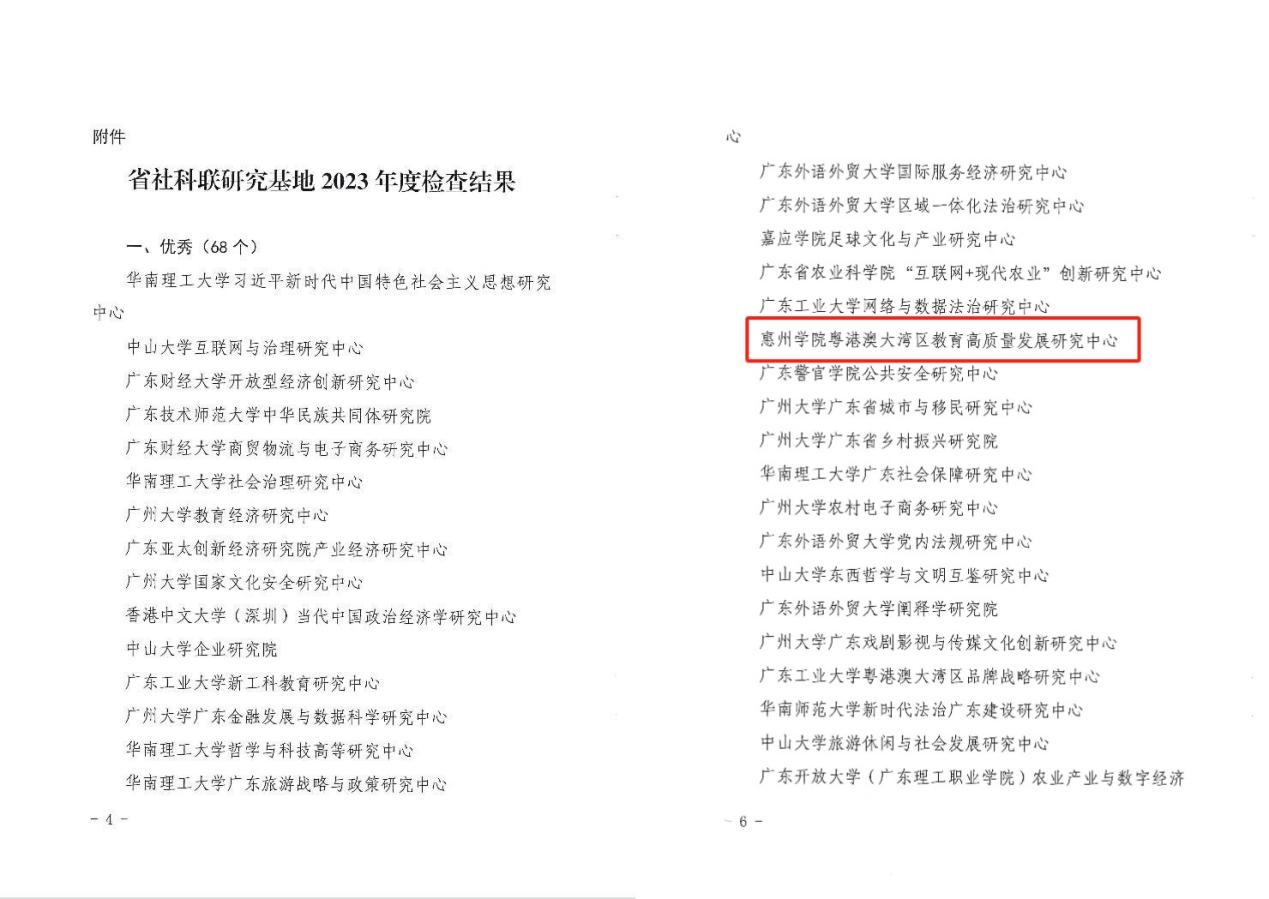 近日,广东省社会科学联合会对133家省社科研究基地开展了2023年度检查,并公布检查结果,我校粤港澳大湾区高质量发展研究中心获得优秀等次。