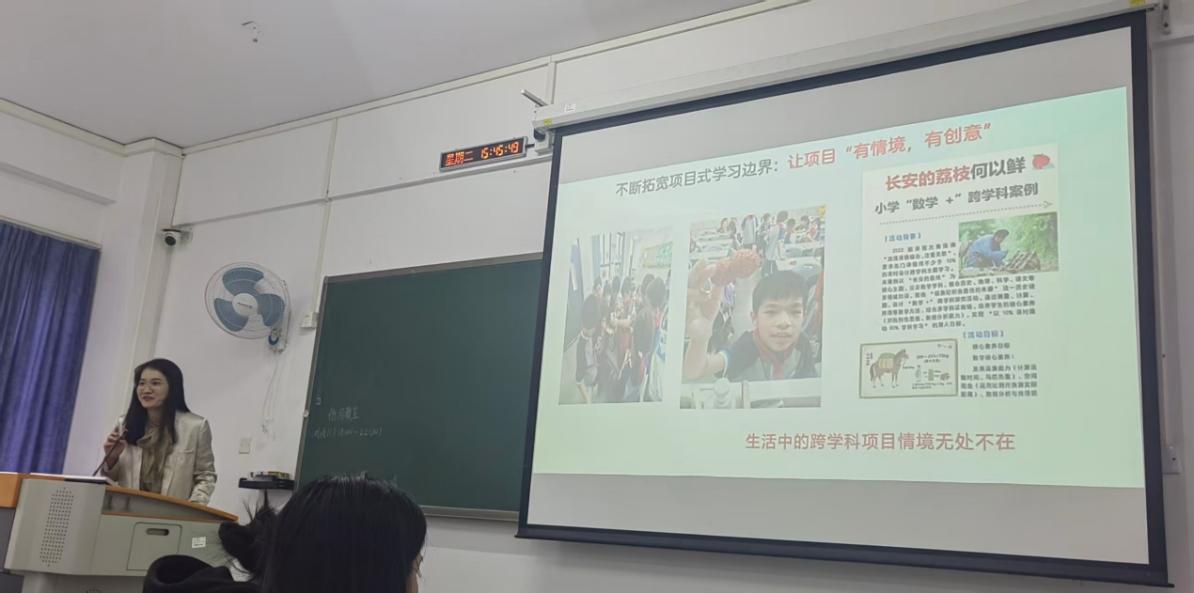 在“部级精品课分享”环节,林老师结合自身在附属学校的教学实践,分享了多个真实课例。她以亲自设计的《小明的一天》数学课为例,生动展示了如何将生活情境融入教学、如何通过问题串激发学生思维、如何在课堂中落实“情境+问题串”的教学策略,为在座学生提供了丰富的教学思路与实操建议。