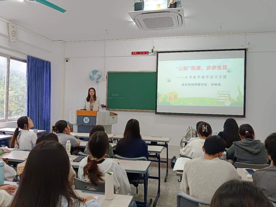 在这收获与沉淀并存的季节里,一场以“三新筑课,步步生花”为主题的嵌入式教学讲座于11月4日下午在旭日楼315教室精彩上演。本次活动由教育科学学院小学教育系卢萌老师主持,特邀惠州学院附属学校林璇璇老师主讲,面向教育科学学院2023级小学教育3班数学方向的全体学生,带来一场兼具理论高度与实践深度的教学分享。