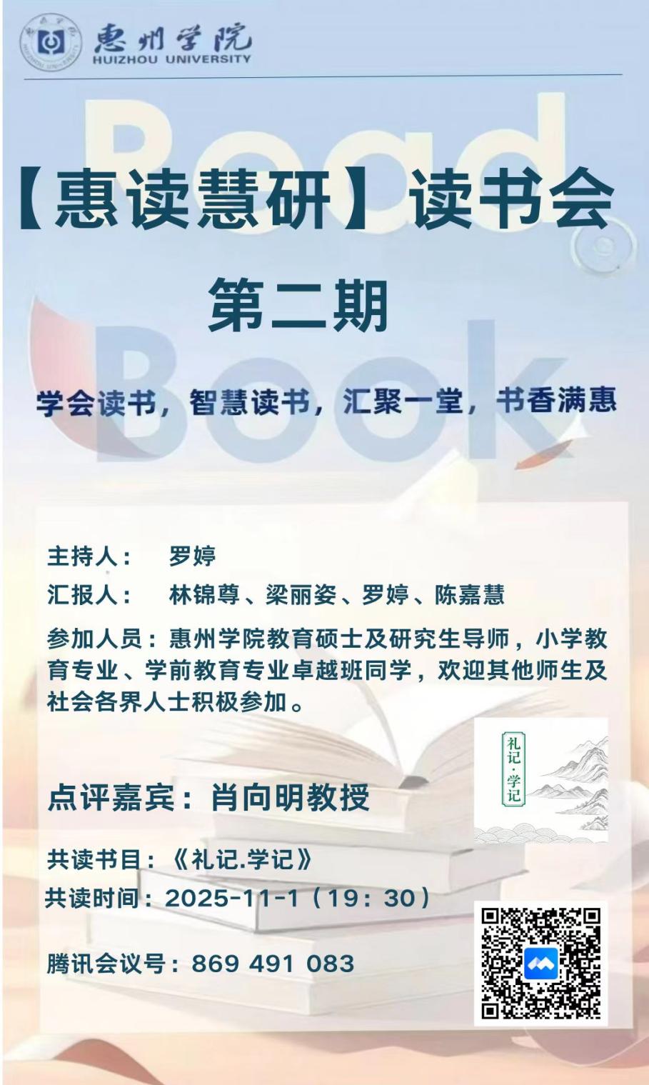 他山之石,可以雕玉。2025年11月1日晚19点30分,教育科学学院第二期“惠读慧研”读书会如期在线上腾讯会议举行。惠州学院教育硕士及研究生导师,小学教育专业、学前教育专业卓越班同学参加了读书会活动。