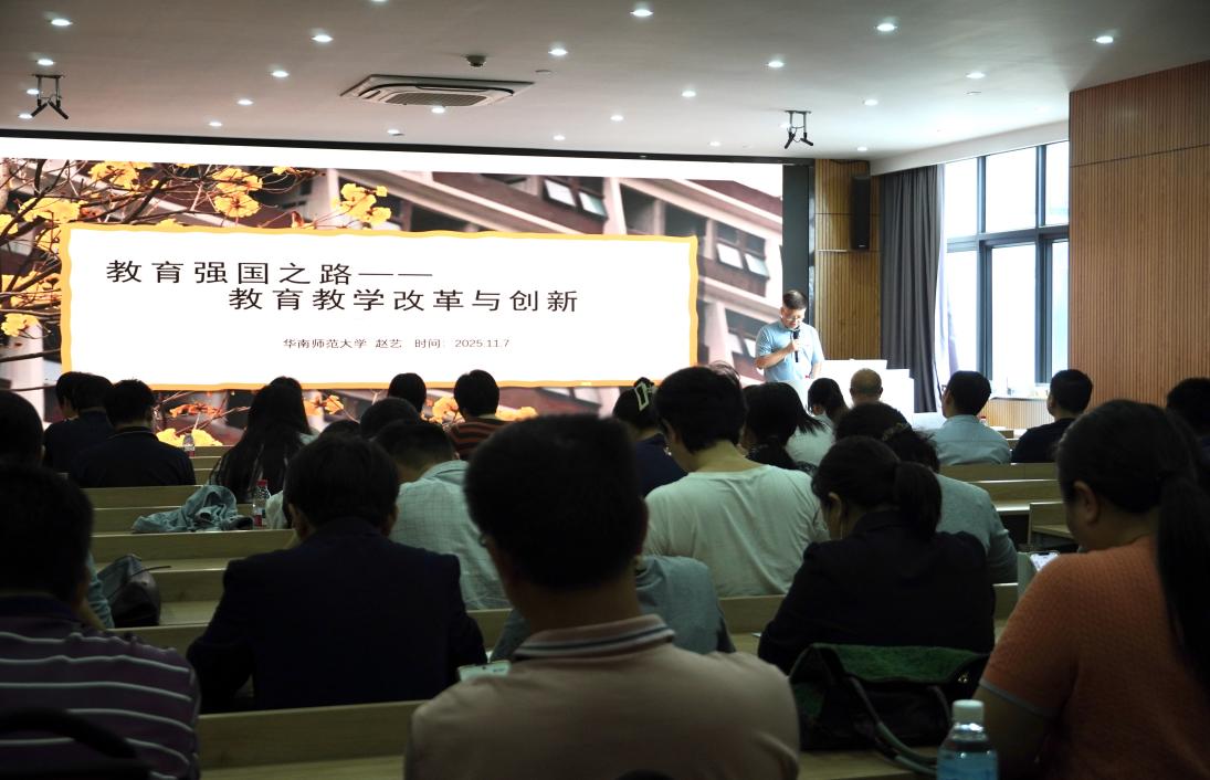 为深入贯彻落实国家教育强国战略部署,聚焦高等教育改革前沿,提升教师教学研究与专业发展能力,2025年11月7日上午,惠州学院教学质量监测与评估中心(教师发展中心)与教务部联合主办的《教育强国之路——教育教学改革与创新》学术讲座在旭日科技大楼A座1303会议室顺利举行。讲座由教务部部长蒋辉主持,教育科学学院党委书记谢伟强、副书记钟小川及各学院专任教师参加学习。