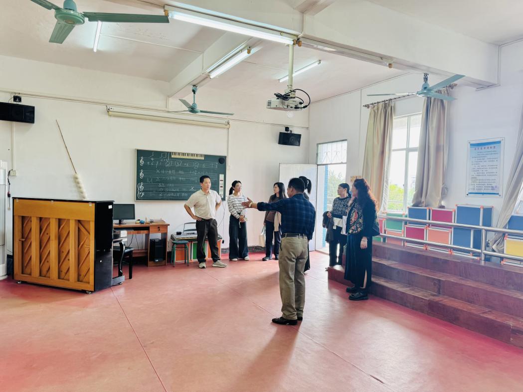 在九龙峰中心小学副校长张东强、副书记黎发谦的陪同下,工作室团队系统考察了学校多功能厅、音乐教室、美术教室等教学场所。走访过程中,校方详细介绍了各功能教室的建设历程、设备配置及使用现状,为后续课程共建与资源整合提供了重要依据。罗晓敏副教授特别关注音乐教室的声学环境与美术教室的展陈条件,就空间优化提出具体建议。