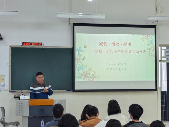 2025年11月6日上午,惠东县稔山中学副校长、数学高级教师、广东省特级教师黄泰宏应邀在我校旭日科技大楼B座305教室,开展了《减负·增效·提质—“双减”下的小学课堂教学新样态》专题讲座。小学教育系主任常攀攀老师主持了本次讲座,小学教育专业卓越班的学生和2023级小学教育专业学生参加了此次讲座。