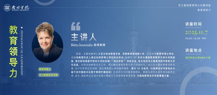 为助力学生开拓国际教育视野,深入领悟前沿教育理念,2025年11月7日上午,芬兰教育专家丽塔博士来惠州学院,为教育科学学院学前教育专业、小学教育专业卓越班学生以及教育硕士研究生,开展了一场以 “教育领导力” 为主题的讲座。讲座由院长谢桂新教授主持,国际交流合作部林红部长等领导和老师参加了讲座。