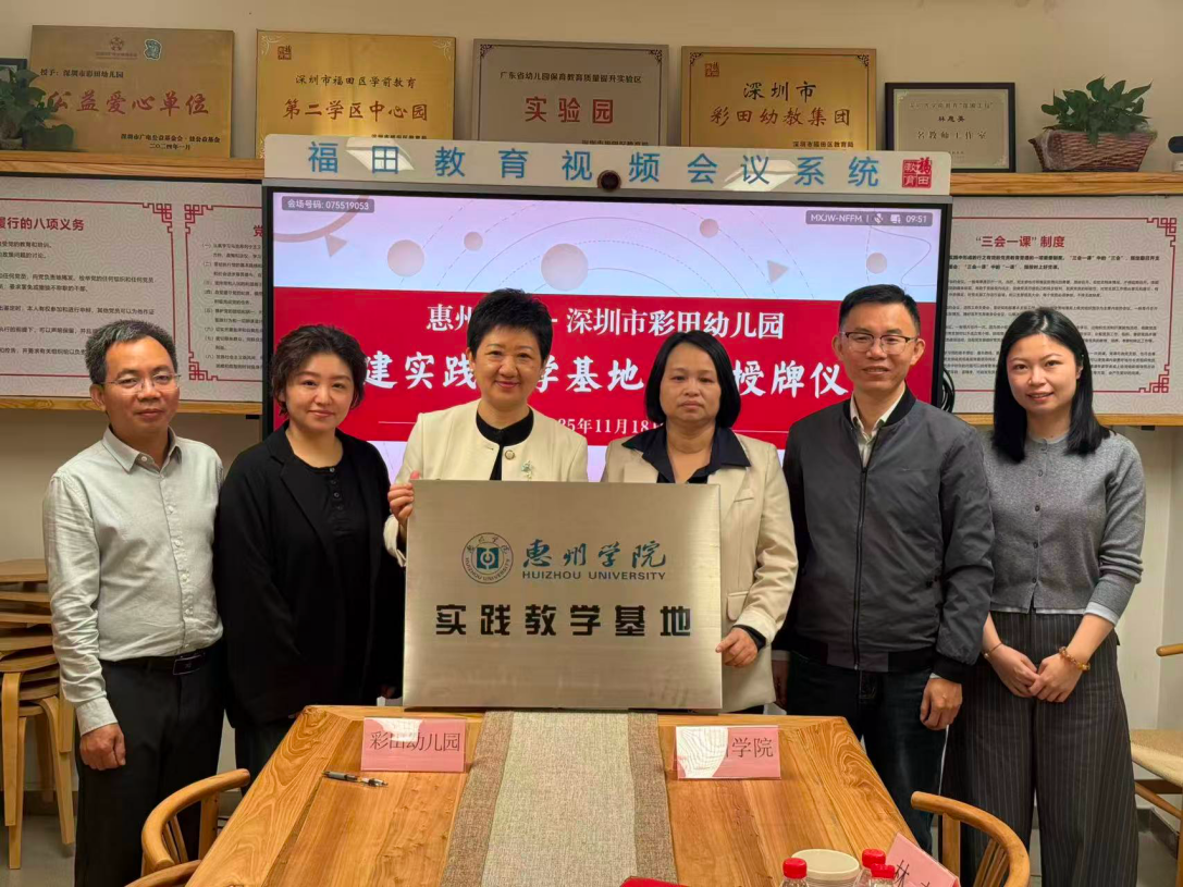 双方围绕学前教育人才培养、课程共建、及毕业生就业等方面进行了深入交流。随后,金艳副院长与彩田幼儿园共同签署了《实践教学基地合作协议》,并授予深圳市彩田幼儿园“惠州学院实践教学基地”牌匾。此次签约授牌,标志着双方合作进入实质性推进阶段。