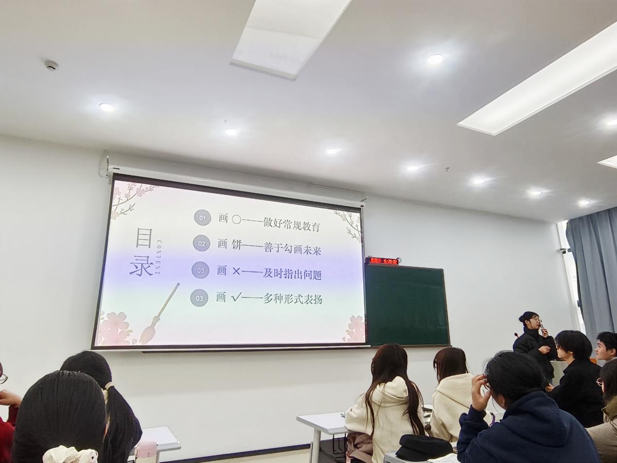 讲座伊始,缪老师以清晨值守、代课迎检、午托巡视等忙碌日常为引,直观展现了班主任工作的琐碎辛劳,结合自身胃病复发的经历,叮嘱同学们重视职业健康。围绕高年级班级管理核心,她分享“画圈、画饼、画叉、画勾”四大心法:“画圈”定规则抓常规,关注特殊学生与价值观引导;“画饼”精准激励不同层次学生,用趣味方式提升课堂专注;“画叉”及时制止小错误,引导学生主动反思;“画勾”点对点肯定行为,多渠道强化正向反馈并搭建家校桥梁。