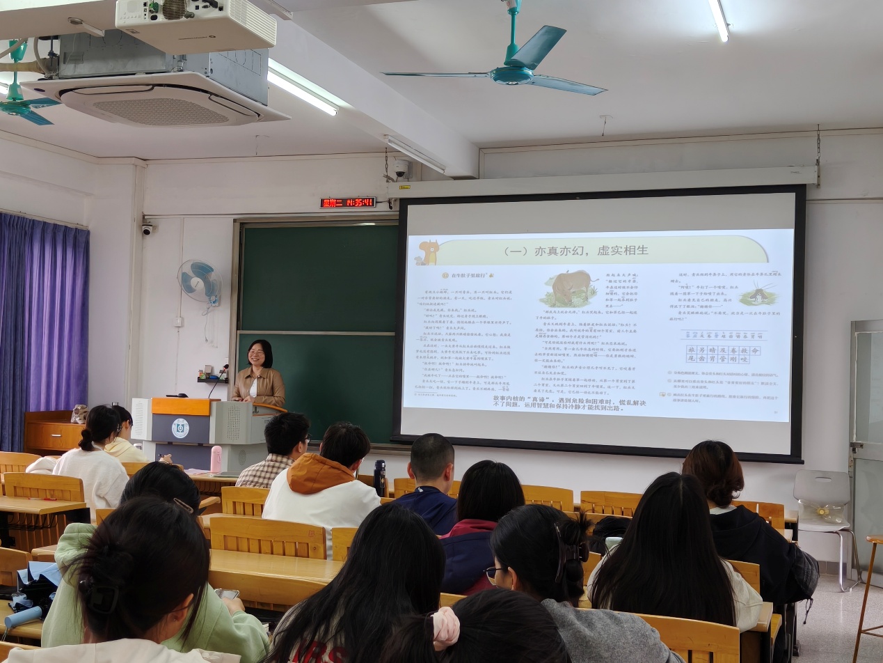 为了加强小学教育专业学生对统编版语文教材中童话文本的深度认识,《儿童文学》课程于2025年11月18日下午,邀请大亚湾西区第一小学郭连芳老师为2023级小学教育专业的同学们带来嵌入式教学专题讲座——《统编教材中童话文本的教学探索》。