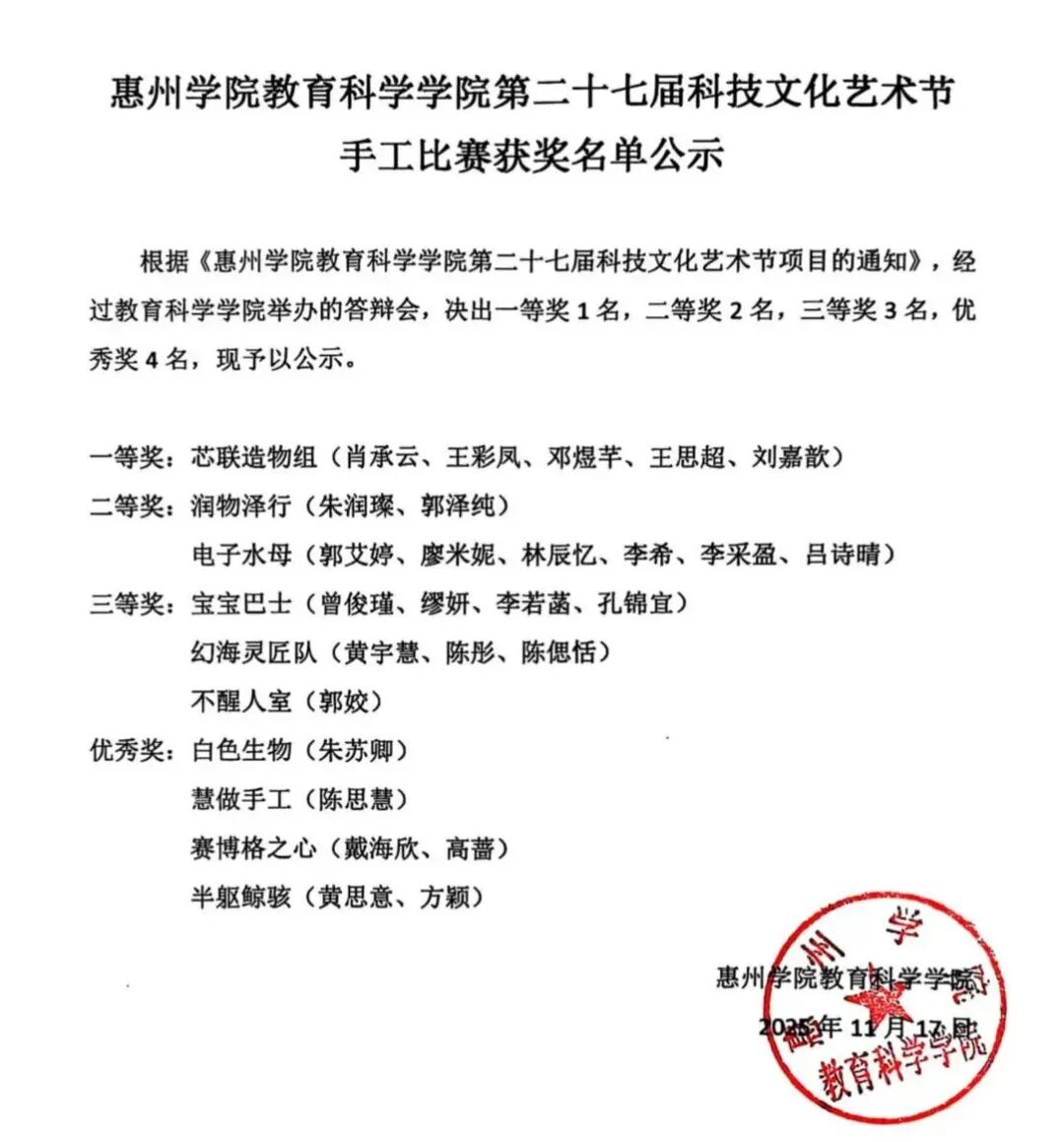 为激发学生对AI与生物交叉领域的探索热情,鼓励参赛者以手工为载体融合科技与艺术、展现AI生物的独特魅力,惠州学院教育科学学院于2025年11月13日在旭日大楼611举办第27届校园手工大赛AI生物作品决赛。本次活动特邀罗晓敏、谢晓谦和张玲三位老师担任评委,在学生的积极参与和激烈角逐下,共有8支队伍脱颖而出,晋级决赛环节。