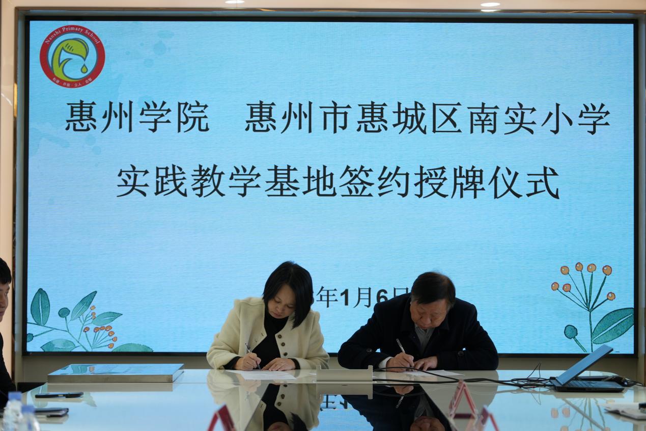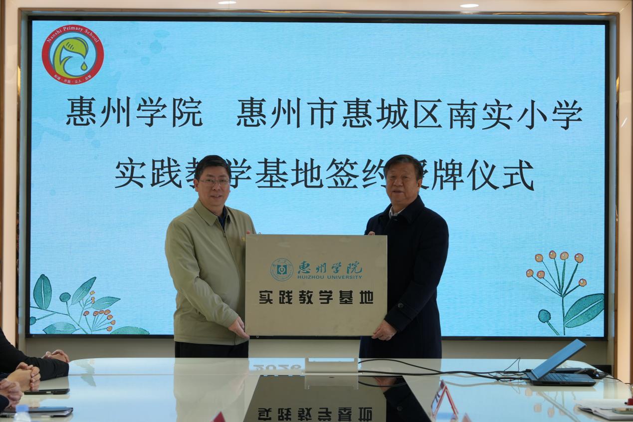 为进一步落实人才培养目标,优化教育资源,拓宽教学实践渠道,2026年1月6日上午,教育科学学院副院长金艳和惠州学院继续教育学院副院长邓伟浩前往惠州市惠城区南实小学举行了实践教学基地签约挂牌仪式。惠州市惠城区南实小学朱文辉校长及其领导班子和南实小学部分教师出席了本次签约挂牌仪式。