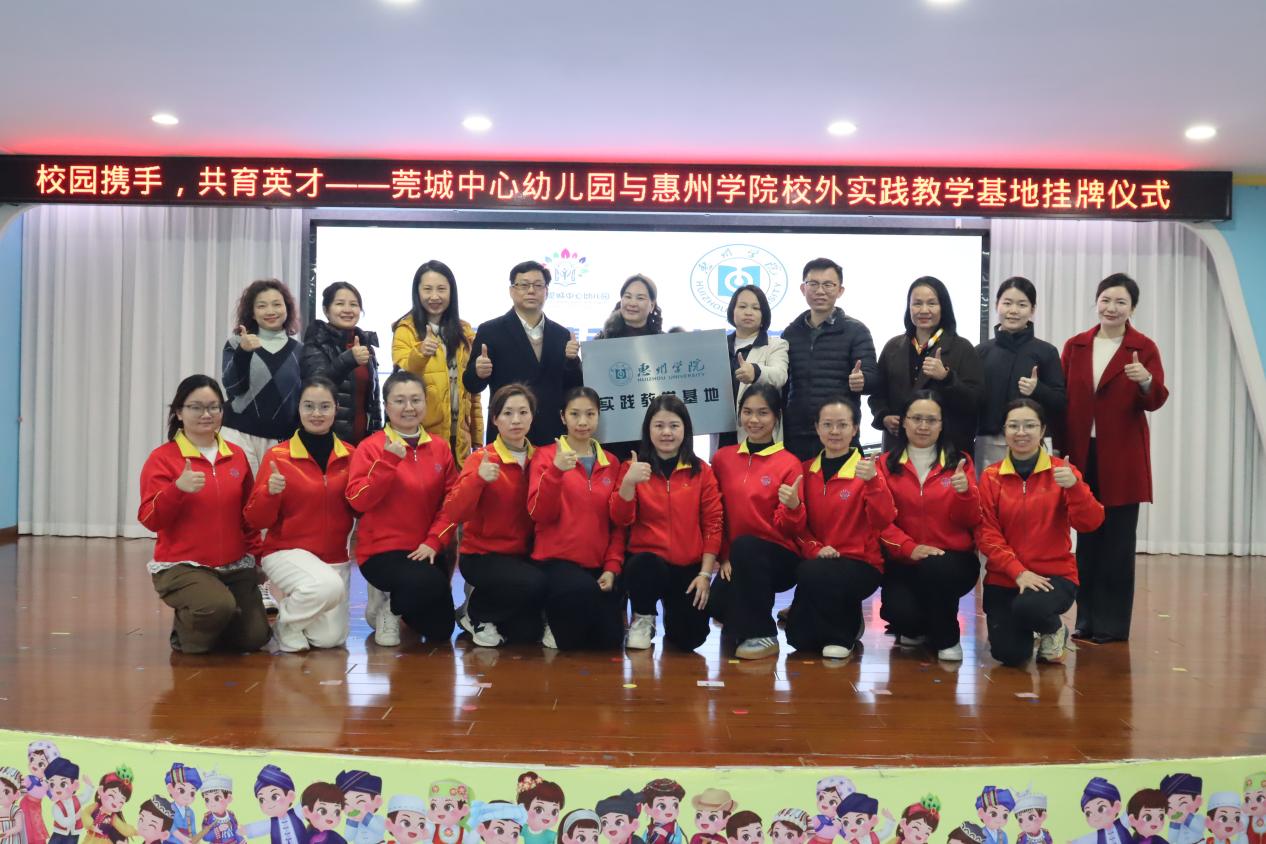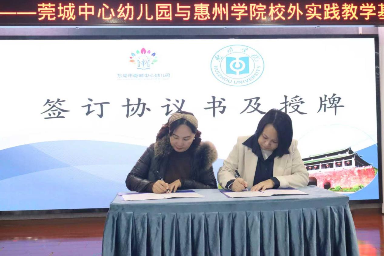 1月7日下午,惠州教育科学学院副院长金艳、学前教育系主任黄国庭和教育科学学院辅导员谢晓谦赴东莞市莞城中心幼儿园,举行“实践教学基地”签约与授牌仪式。莞城教育管理中心主任刘泉先、副主任张玮莅临见证,莞城中心幼儿园园长罗润娣携行政团队热情接待。双方就实习基地建设、实习生选派等签署合作协议,并共同为基地揭牌。