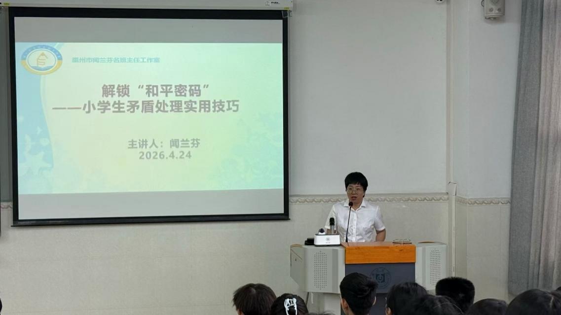 2026年4月24日,由教育科学学院主办的嵌入式教学讲座顺利开展。本次活动由教育科学学院小学教育系卢萌老师主持,特邀惠州市名班主任工作室主持人、惠州市合生实验学校资深班主任闻兰芬老师主讲,围绕《解锁“和平密码”--小学生矛盾处理实用技巧》这一主题,为教育科学学院2023级小学教育师范生带来了一场干货满满、接地气的经验分享。